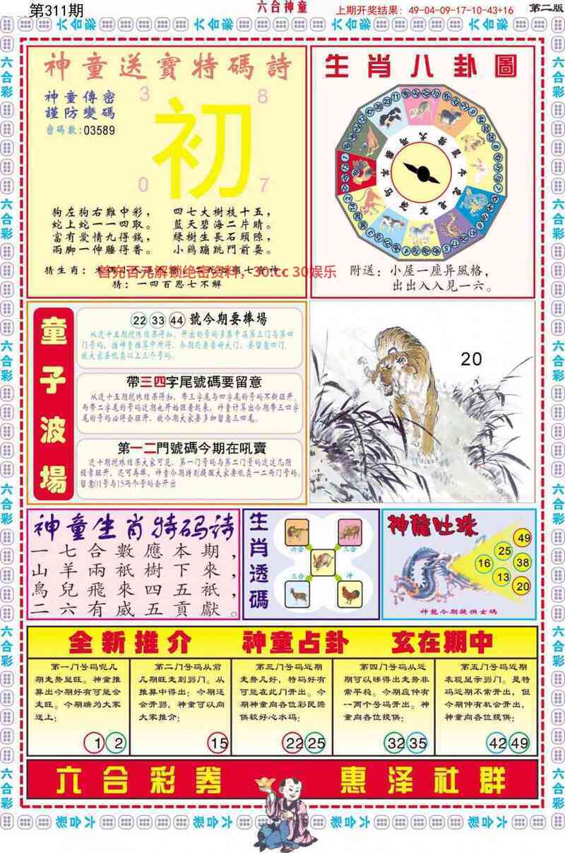 | 310期:六肖中特【牛鸡马虎猴猪】开:虎16中 |